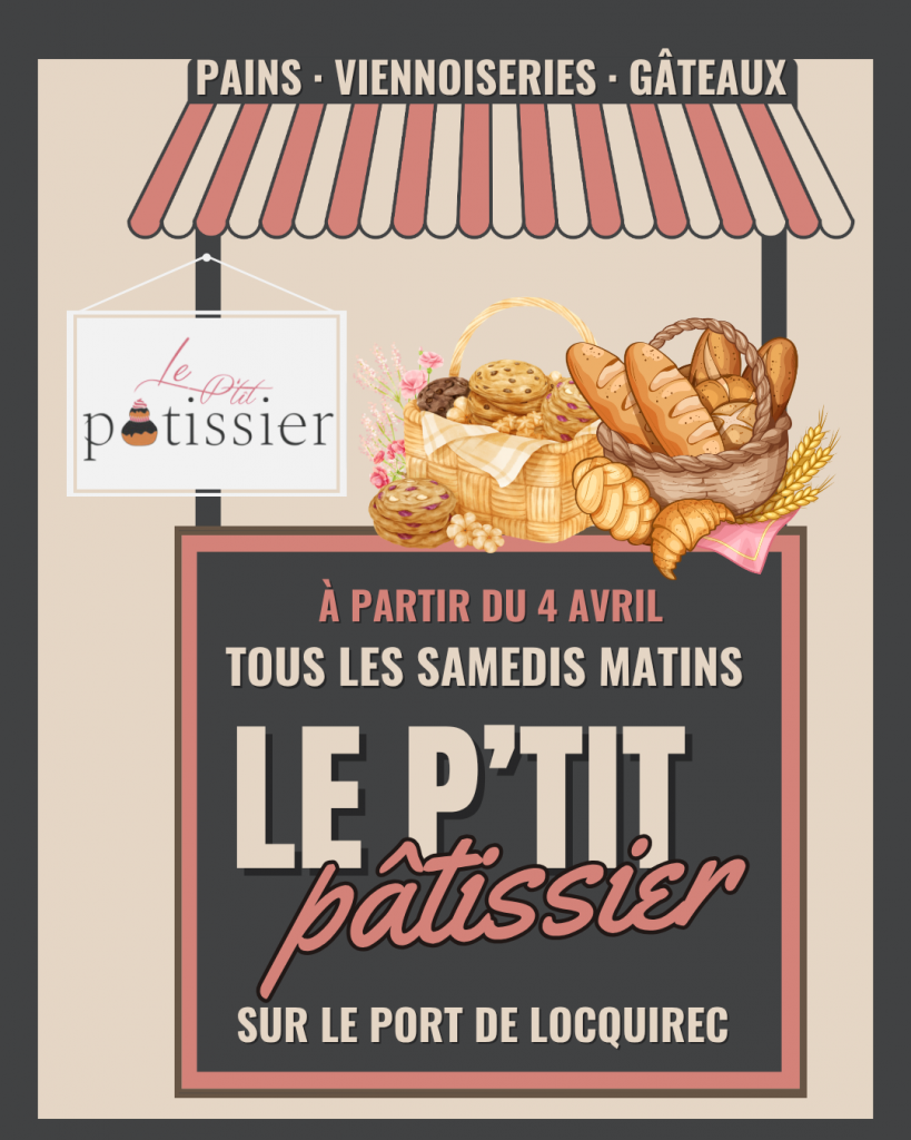 Et en bonus : à partir du samedi 4 avril, rendez-vous sur le Port de Locquirec! Le P’tit Pâtissier sera présent tout l’été sur le port de Locquirec, et vous proposera viennoiseries, pains et gâteaux. Toujours Bio, toujours avec le sourire !